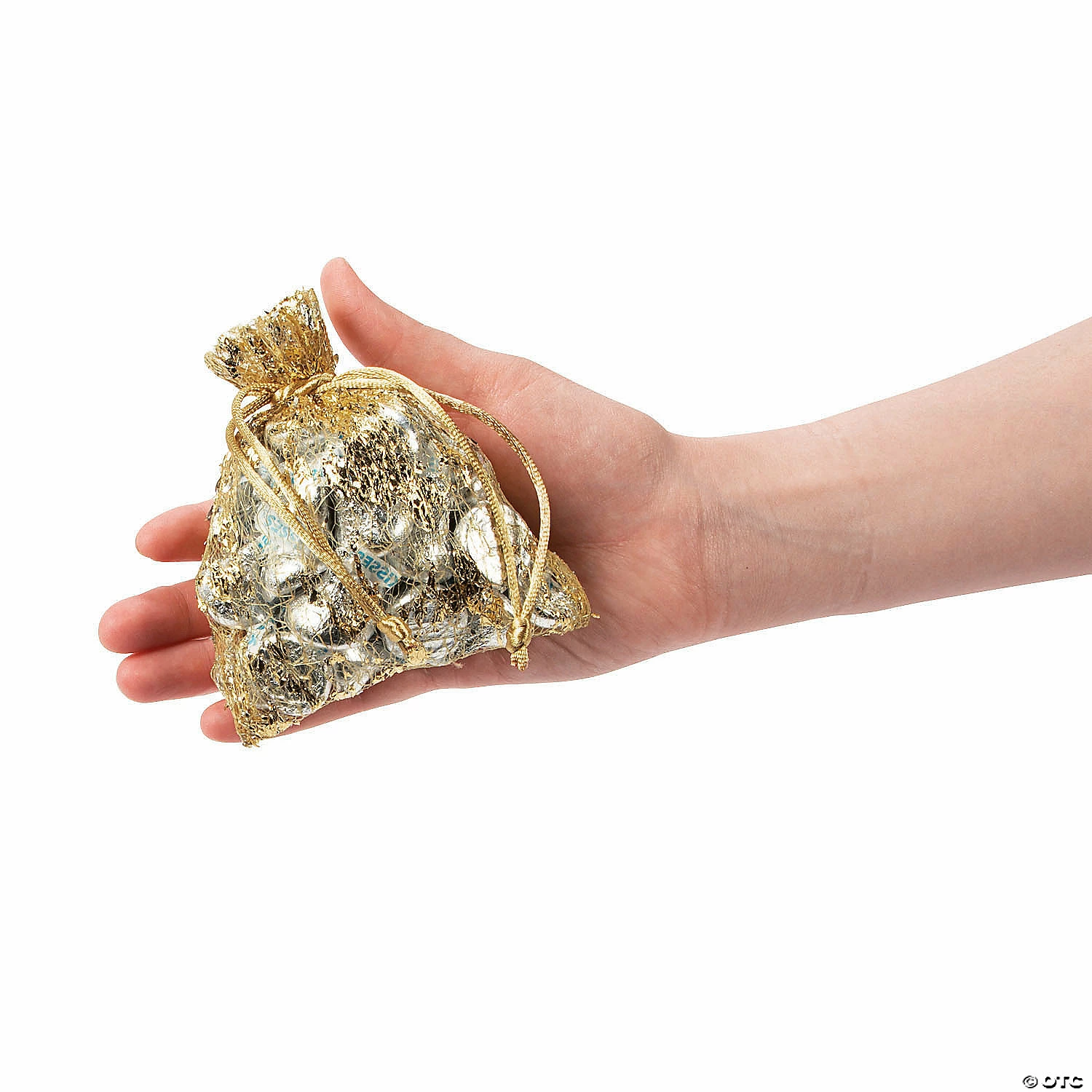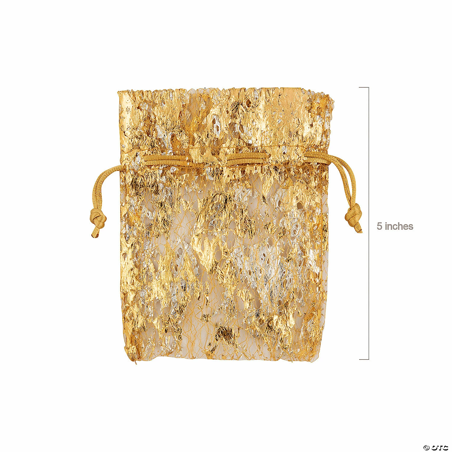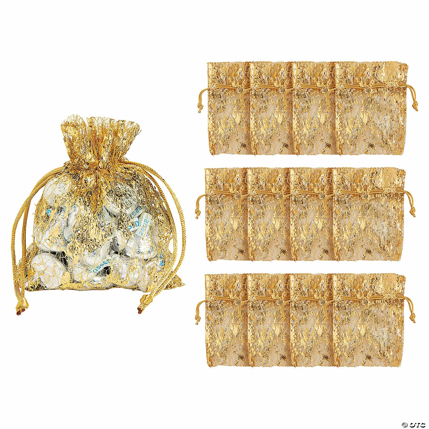 • Perfect Size for Parties: These treat bags are just the right size for candies. Fill them up with tasty treats and hand them out as party favors at your next birthday party, holiday gathering or wedding reception!• Travel-Friendly: Once the party is over, your guests will be happy to take home your favorite cookies, cake pops, cupcakes or other baked goods in these easy-to-carry bags. • Say Thanks with Sweets: Are you looking for an easy way to thank the people in your life? These multipurpose bags filled with great snacks are a sweet way to spread appreciation among party guests, students and teachers, or employees!Add some glimmer to your reception favors! These lovely, textured organza drawstring bags are perfect for an elegant reception and can be used as favor bags for guests. Either pre-fill these opulent bags or leave a stack of the bags at the treat table and allow guests to fill the bags themselves. A great choice for gold-themed weddings or any other formal affair, guests will be impressed by the look of these textured bags.Size: 4″ x 5″Quantity: 12Material: Organza.