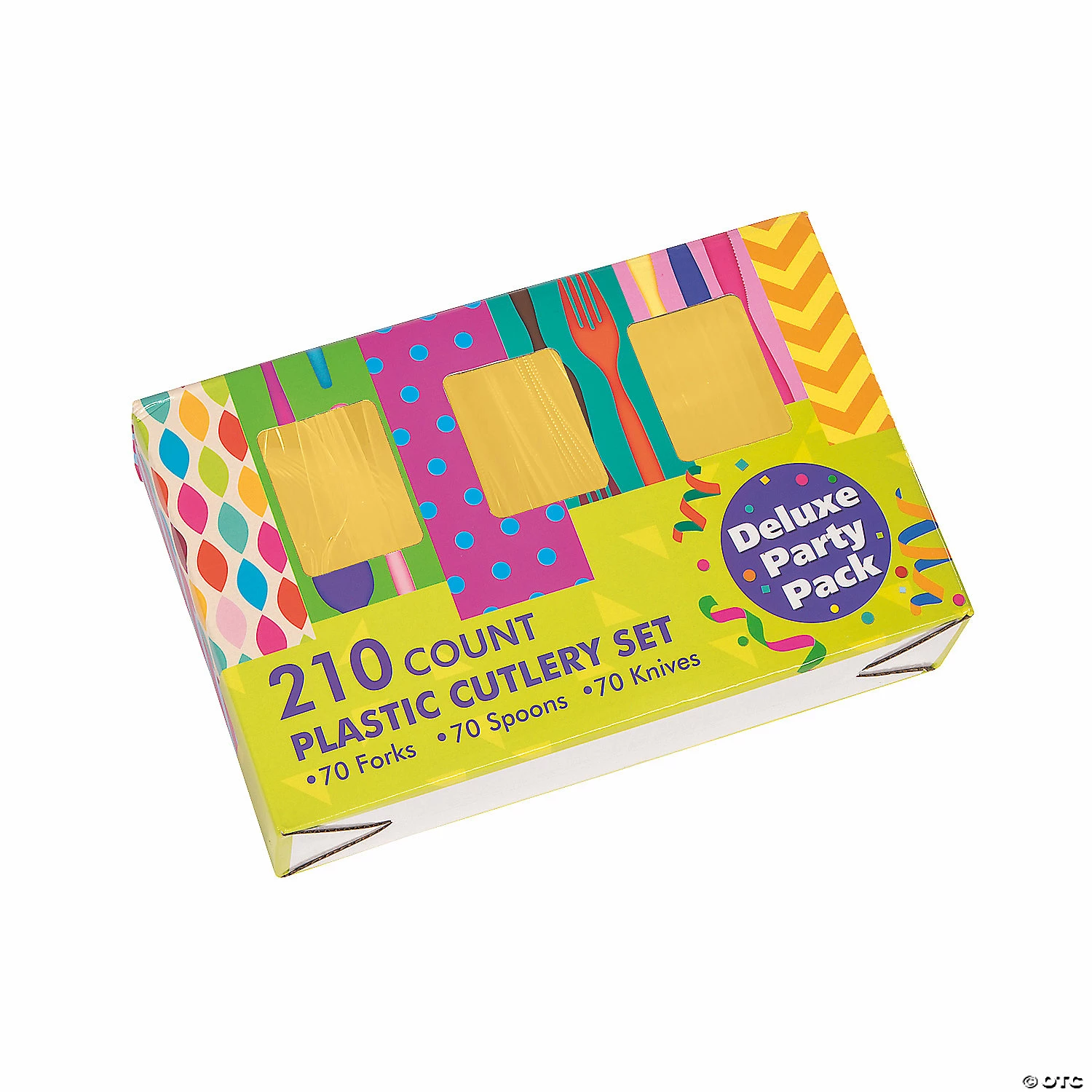 Who wants to do dirty dishes when there’s fun to be had? Stock up on durable plastic utensils with these High Count Cutlery Sets and leave the cleanup time behind! These sets include plenty of plastic forks, plastic knives and plastic spoons for your whole group, and you can easily match it to your party supplies, party theme or décor. Includes 70 of each: forks, knives and spoons. Plastic. (210 pcs. per unit) Approx. 6″ each.• Serves 70 guests.