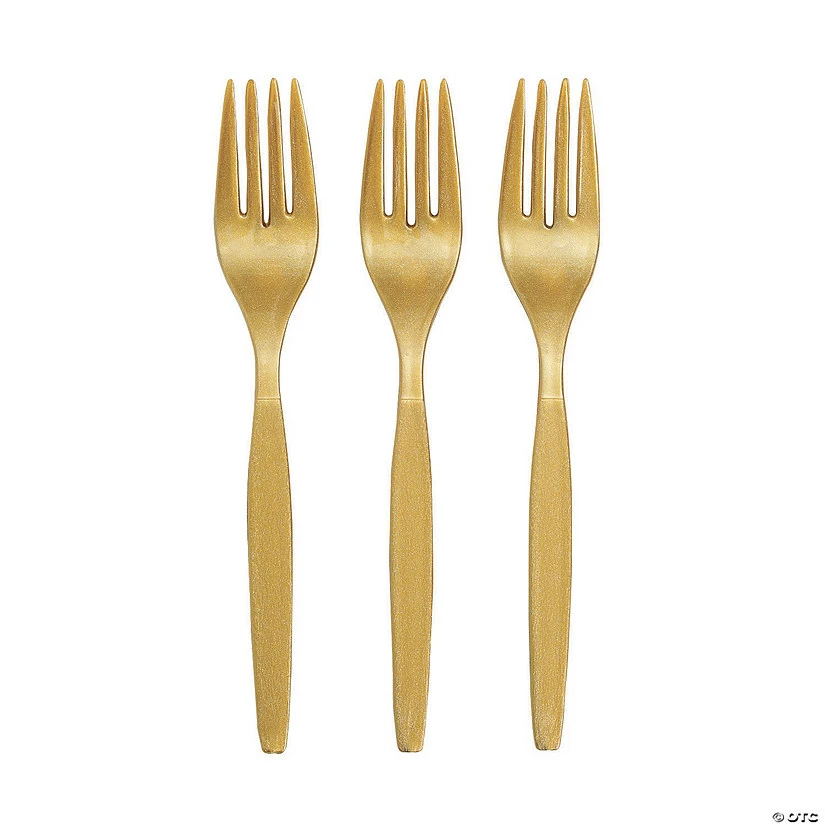 • All Occasion Use: Includes 50 metallic gold plastic forks for elegant gatherings, from birthday parties and wedding receptions to showers and graduations! • Elevate Any Party: These metallic gold forks are the ideal party supplies to add elegance to any party. You can wash them for reuse or toss them for quick cleanup.• Construction and Care: The party cutlery is made of durable plastic. We recommend hand washing them if you reuse. • Your Party Superstore: We are your one-stop party shop! Come to Oriental Trading for all of your party supply needs, from party decorations to tableware to party favors and more.Product Description: Add a dash of class to your next large event without emptying your wallet with these metallic gold plastic forks. They’re a great addition to your party supplies because they make every bite shine! Specs: Quantity: 50Material: Plastic