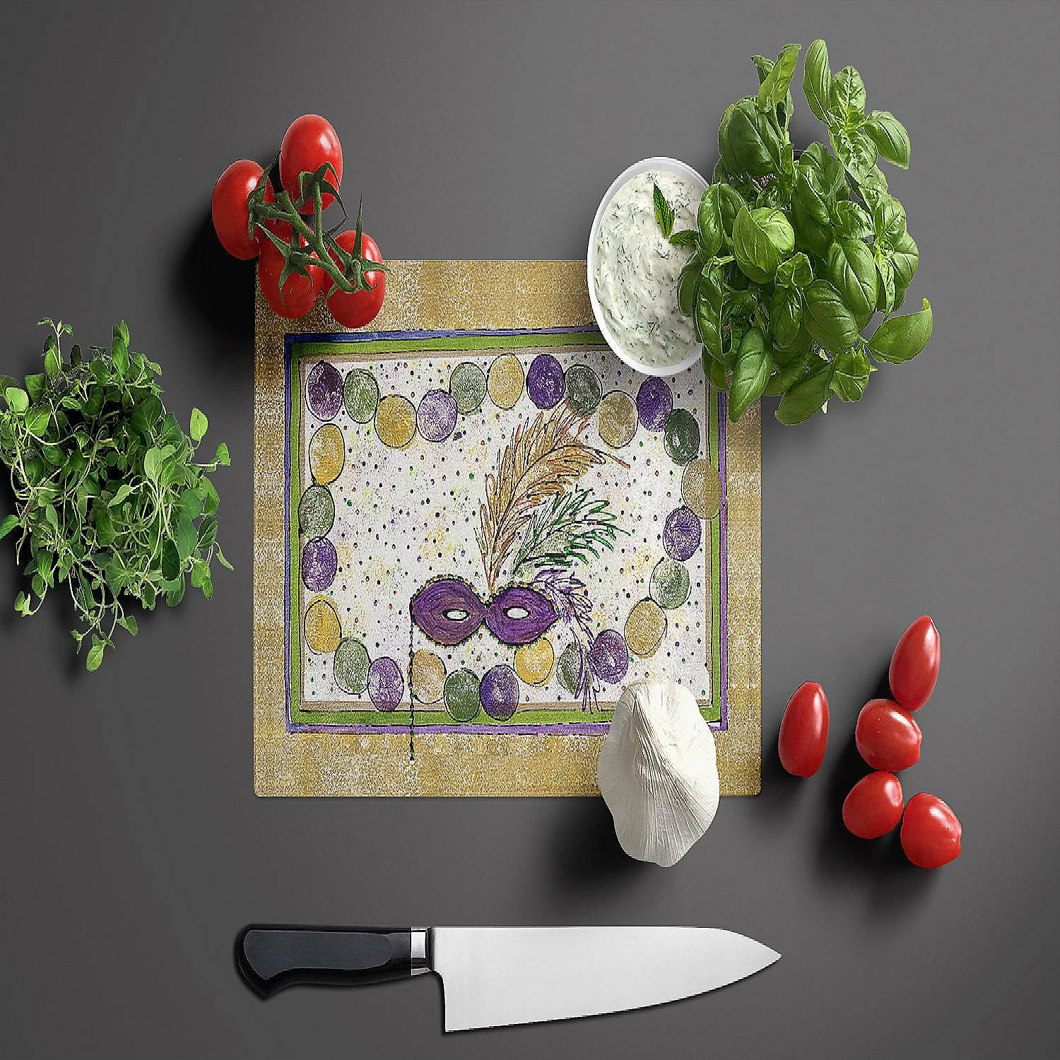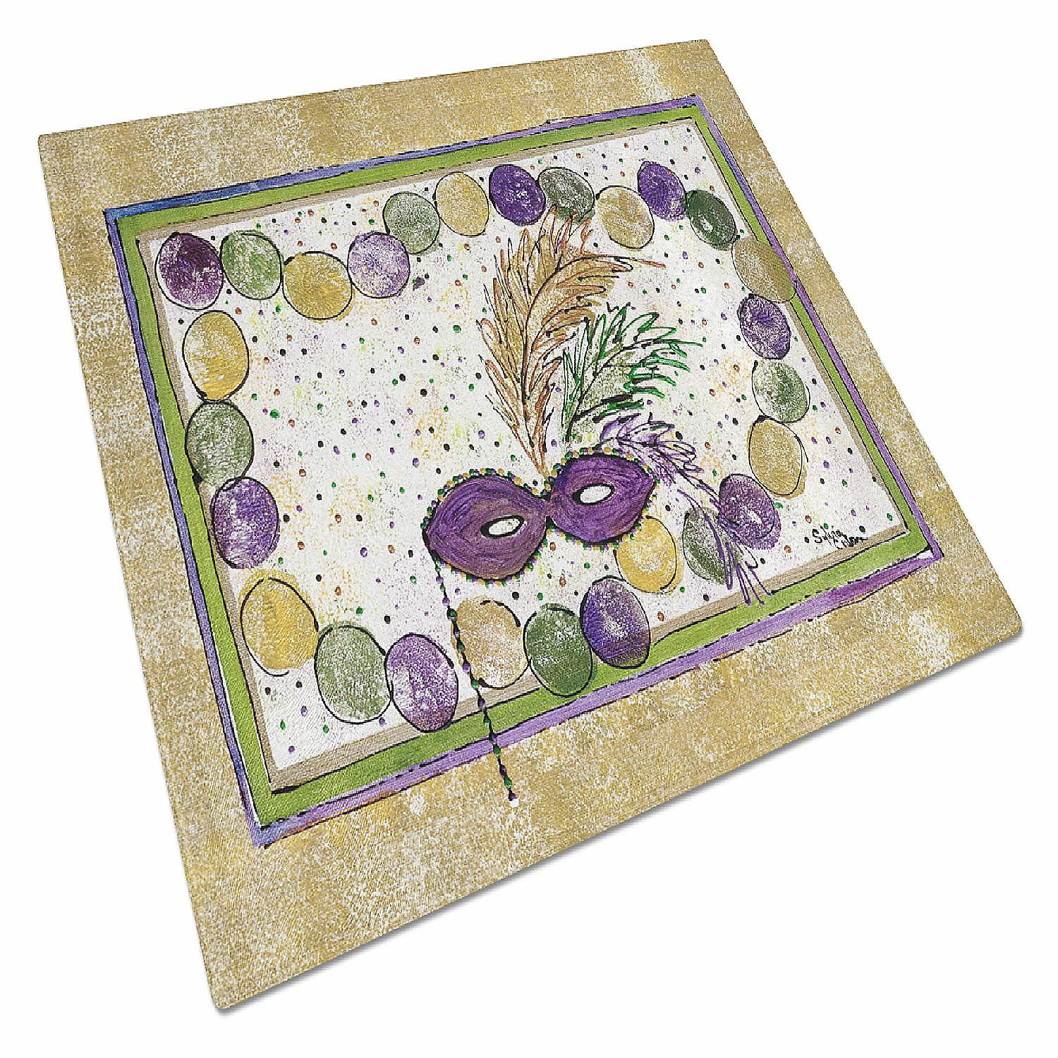 Mardi Gras Beads Glass Cutting Board Large. Celebrate Mardi Gras with this Mardi Gras Cutting Board. Large Tempered Glass Cutting Board from Caroline’s Treasures colorful kitchen product line is heat resistant and should be hand wash only. This chopping board is bright and colorful. This cutting board is made of tempered glass. These unique cutting boards feature artwork from some of your favorite artists. The Board measures 15 inches high and 12 inches long. They will beautify and protect your counter top. They are heat resistant, non skid feet, and virtually unbreakable! The corners are rounded to help protect the board. Feet bumpers are included to keep the cutting board in place while in use. Cutting boards are printed and assembled in the United States. This Cutting Board is from Caroline’s Treasures New Orleans category of products.