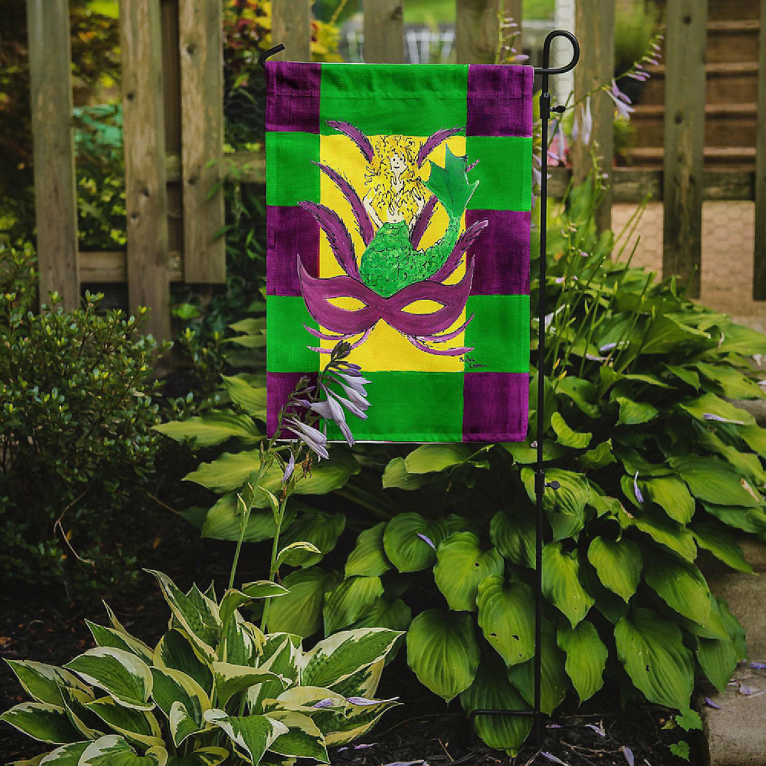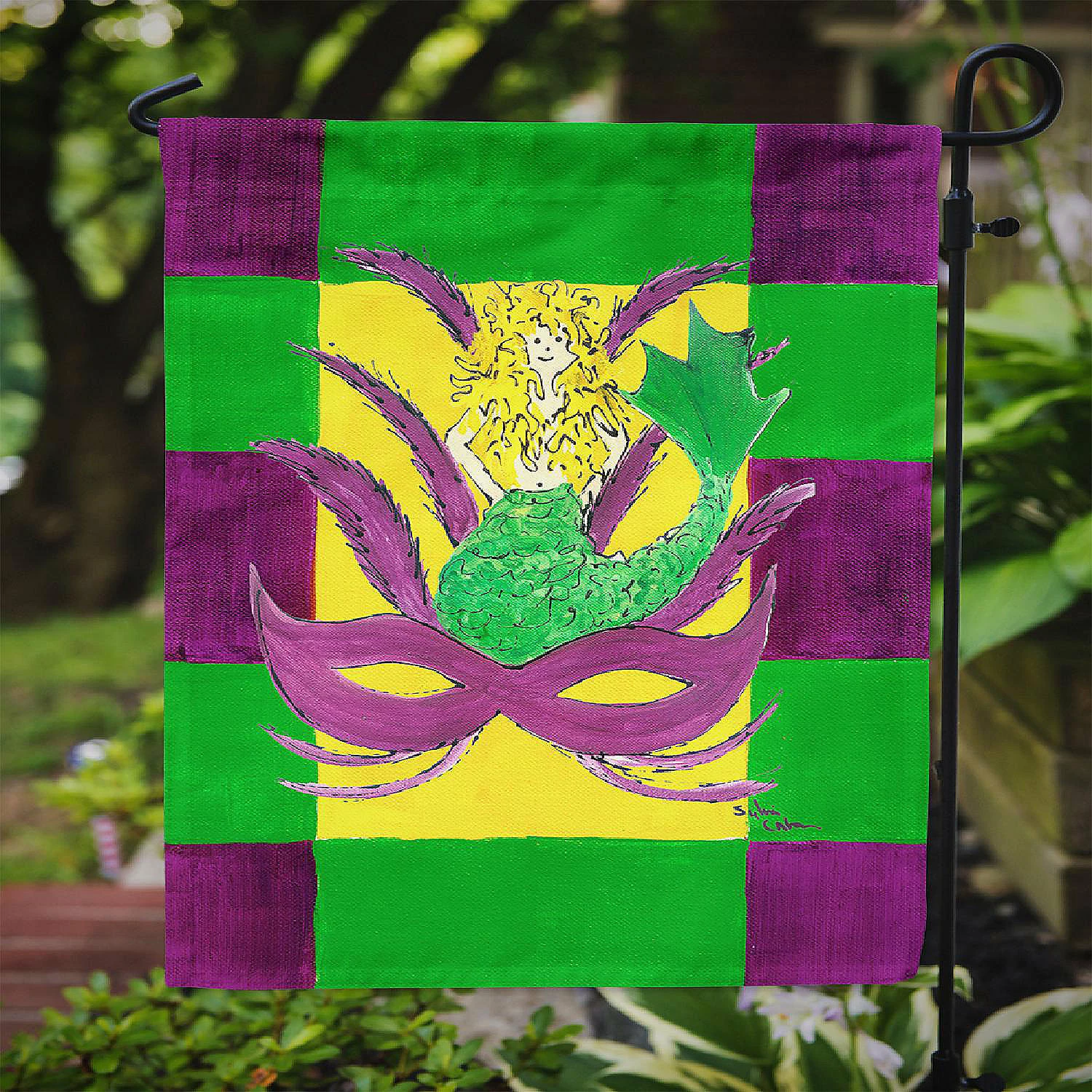 Mardi Gras Blonde Mermad with Mask Flag Garden Size. Celebrate Mardi Gras with this Mardi Gras Garden Flag. Artwork for your garden, patio or yard. This is a thick Double sided garden flag made from two pieces of polyester fabric. This 2 ply garden size flag is water resistant and weather proof. Words on the flag can be read correctly on both sides of the garden flag. Heavier than most other garden flags available. This flag will hold up in wind, rain and snow. Make your personal statement in your outdoor decor with this colorful quality garden flag. The flag measures approximately 11 1/4 inches x 15 1/2 inches. The flag has a 1 1/2 inch sleeve sewn in to allow you to attach the flag to any standard garden flag stand or garden size porch hanger. The garden stand is sold seperately. This Garden Flag is from Caroline’s Treasures New Orleans category of products.