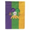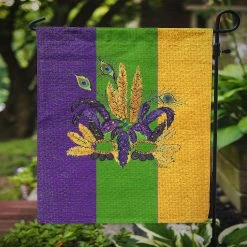 Mardi Gras Feathered Mask Flag Garden Size. Celebrate Mardi Gras with this Mardi Gras Garden Flag. Artwork for your garden, patio or yard. This is a thick Double sided garden flag made from two pieces of polyester fabric. This 2 ply garden size flag is water resistant and weather proof. Words on the flag can be read correctly on both sides of the garden flag. Heavier than most other garden flags available. This flag will hold up in wind, rain and snow. Make your personal statement in your outdoor decor with this colorful quality garden flag. The flag measures approximately 11 1/4 inches x 15 1/2 inches. The flag has a 1 1/2 inch sleeve sewn in to allow you to attach the flag to any standard garden flag stand or garden size porch hanger. The garden stand is sold seperately. This Garden Flag is from Caroline’s Treasures New Orleans category of products.