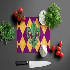 Mardi Gras Fleur de lis Glass Cutting Board Large. Celebrate Mardi Gras with this Mardi Gras Cutting Board. Large Tempered Glass Cutting Board from Caroline’s Treasures colorful kitchen product line is heat resistant and should be hand wash only. This chopping board is bright and colorful. This cutting board is made of tempered glass. These unique cutting boards feature artwork from some of your favorite artists. The Board measures 15 inches high and 12 inches long. They will beautify and protect your counter top. They are heat resistant, non skid feet, and virtually unbreakable! The corners are rounded to help protect the board. Feet bumpers are included to keep the cutting board in place while in use. Cutting boards are printed and assembled in the United States. This Cutting Board is from Caroline’s Treasures New Orleans category of products.