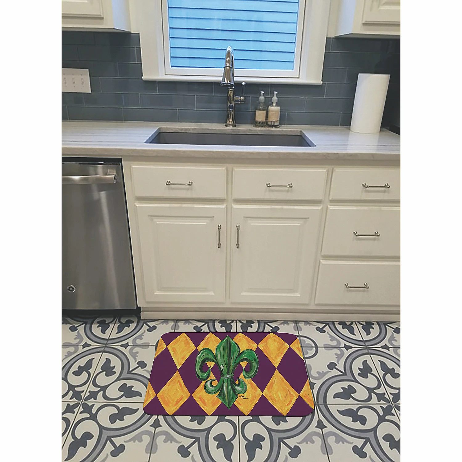 Mardi Gras Fleur de lis Machine Washable Memory Foam Mat. Celebrate Mardi Gras with this Mardi Gras Floor Mat. Artwork on the floor of your bathroom. Plush top and very comfortable to the touch. This is a Machine Washable bath or kitchen mat that is made with Memory Foam. It features a top surface in coral fleece and is made using 100% microfiber fabric. The entire surface is full-cushion memory foam, ensuring the ultimate in comfort. The underside of the mat features a non-skid SBR surface for the best in safety and convenience. It measures 19 inches by 27 inches and is Proudly Printed in the USA with artwork from our licensed Artists. The design is dyed into the fibers of the rug for a long lasting image. Wash in cold water and dry in the dryer on low temp. Follow the care instructions on the product tag. This Floor Mat is from Caroline’s Treasures New Orleans category of products.
