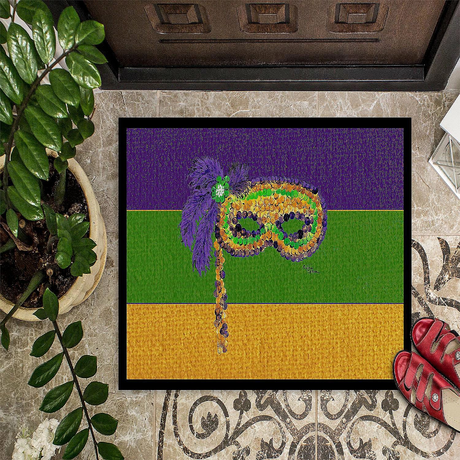 Mardi Gras Mask on Stick Indoor or Outdoor Mat 24×36. Celebrate Mardi Gras with this Mardi Gras Doormat. Welcome your family and friends with this Artwork mat in full color. This action backed mat with hold up in almost any weather condition. This door mat measures about 24 inches by 36 inches and has a black binding tape to hold it’s many layers together. The top layer is a polyester felt that is dyed with the image that you see on the mat. The next couple of layers give the mat stability and the bottom of the mat is rubber that has been stamped to help prevent slipping. To clean this mat, hose it off with a water hose or use a powerwasher. Do not use any cleaner that produces suds. This Doormat is from Caroline’s Treasures New Orleans category of products.