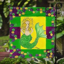 Mardi Gras Mermaid Flag Garden Size. Celebrate Mardi Gras with this Mardi Gras Garden Flag. Artwork for your garden, patio or yard. This is a thick Double sided garden flag made from two pieces of polyester fabric. This 2 ply garden size flag is water resistant and weather proof. Words on the flag can be read correctly on both sides of the garden flag. Heavier than most other garden flags available. This flag will hold up in wind, rain and snow. Make your personal statement in your outdoor decor with this colorful quality garden flag. The flag measures approximately 11 1/4 inches x 15 1/2 inches. The flag has a 1 1/2 inch sleeve sewn in to allow you to attach the flag to any standard garden flag stand or garden size porch hanger. The garden stand is sold seperately. This Garden Flag is from Caroline’s Treasures Fantasy category of products.