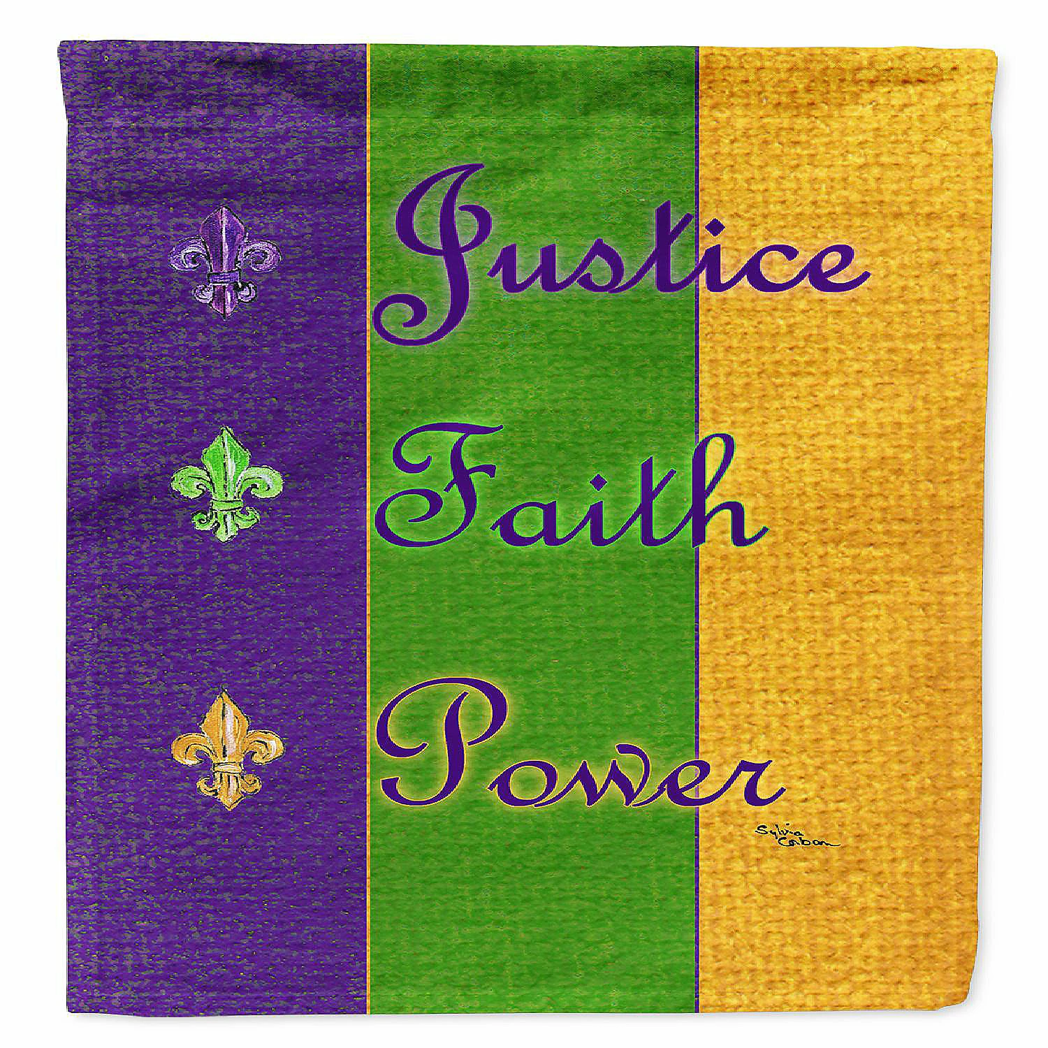Mardi Gras Peace Faith and Justice Flag Garden Size. Celebrate Mardi Gras with this Mardi Gras Garden Flag. Artwork for your garden, patio or yard. This is a thick Double sided garden flag made from two pieces of polyester fabric. This 2 ply garden size flag is water resistant and weather proof. Words on the flag can be read correctly on both sides of the garden flag. Heavier than most other garden flags available. This flag will hold up in wind, rain and snow. Make your personal statement in your outdoor decor with this colorful quality garden flag. The flag measures approximately 11 1/4 inches x 15 1/2 inches. The flag has a 1 1/2 inch sleeve sewn in to allow you to attach the flag to any standard garden flag stand or garden size porch hanger. The garden stand is sold seperately. This Garden Flag is from Caroline’s Treasures New Orleans category of products.