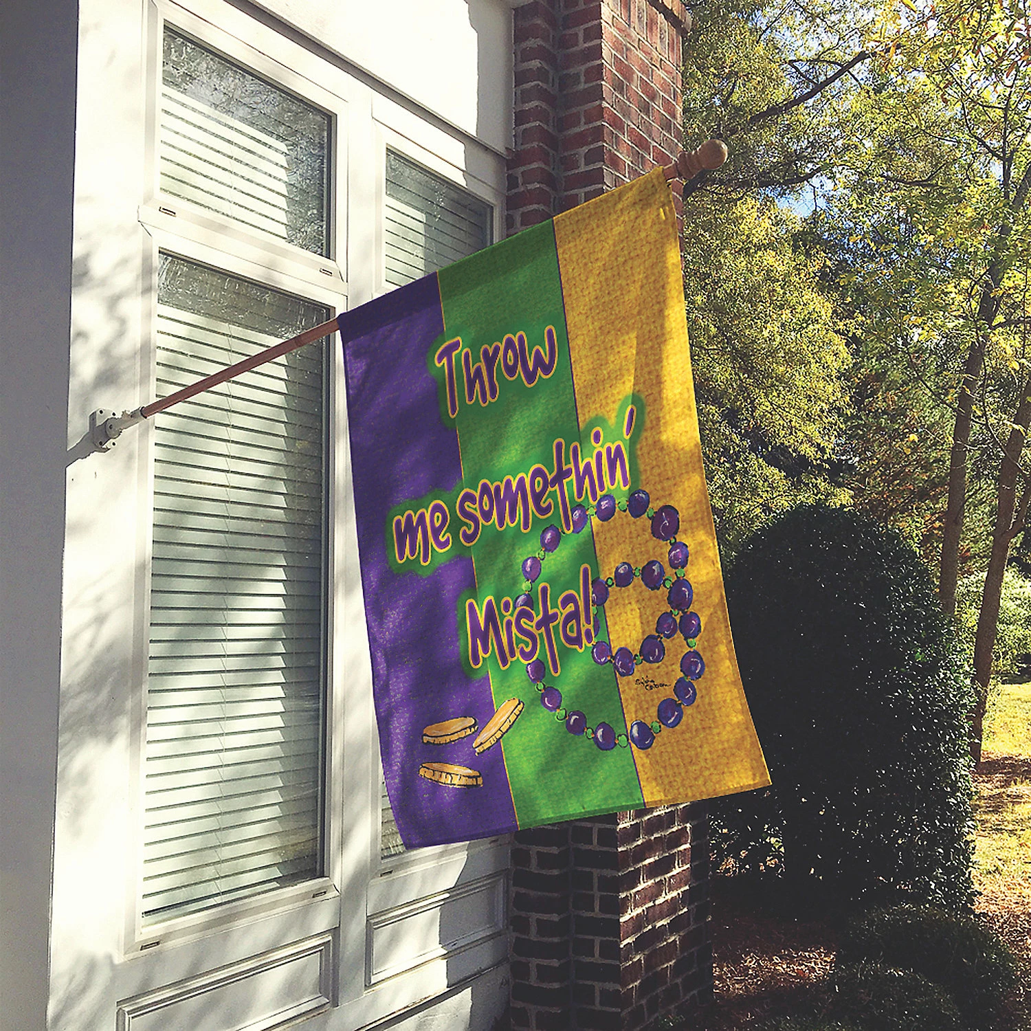 Mardi Gras Throw me something mister Flag Canvas House Size. Celebrate Mardi Gras with this Mardi Gras Large Flag. Heavy Duty Polyester House Size Decorative Sleeve Pole Flag. Each flag measures approximately 28 x 40 inches. This flag is sewn and made one at a time and may vary slightly in size. This is a sleeve pole flag that will fit a standard decorative flag pole. The flag pole and bracket are not included and should be purchased seperately. The flag is printed on both sides of the fabric with one side mirroring the other side. Each flag is printed in full color and they dyes are heat set for durability. This Large Flag is from Caroline’s Treasures New Orleans category of products.