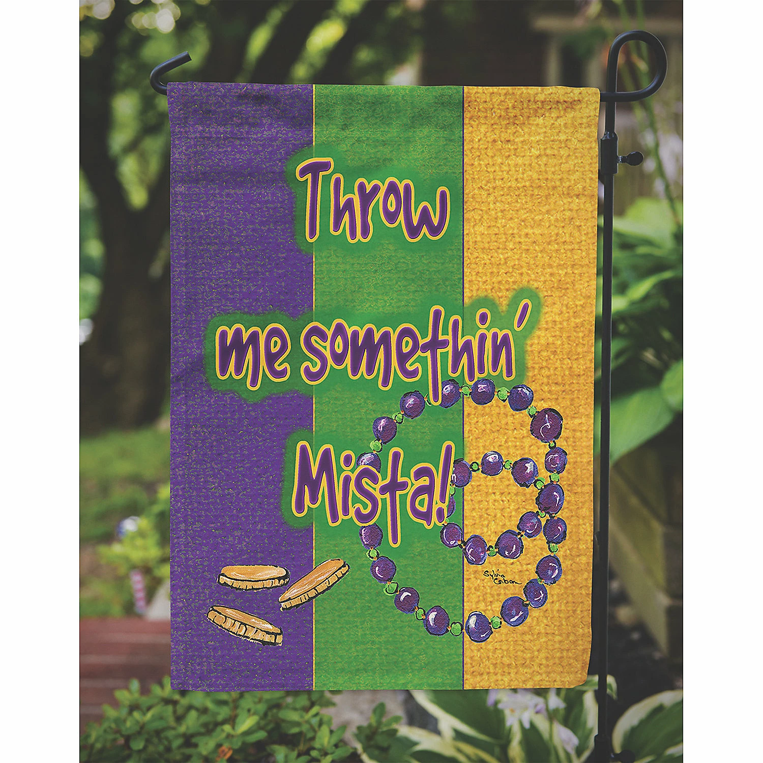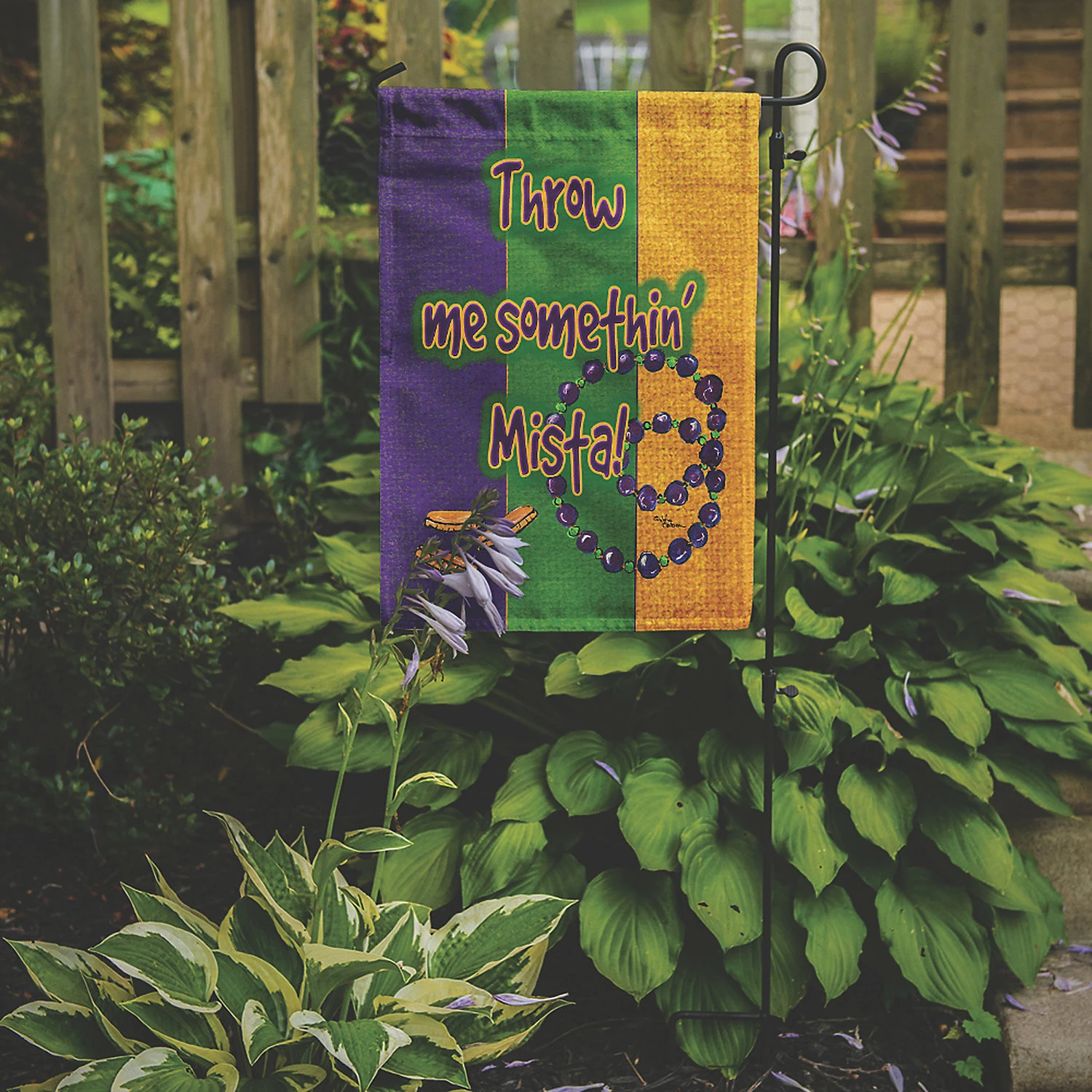 Mardi Gras Throw me something mister Flag Garden Size. Celebrate Mardi Gras with this Mardi Gras Garden Flag. Artwork for your garden, patio or yard. This is a thick Double sided garden flag made from two pieces of polyester fabric. This 2 ply garden size flag is water resistant and weather proof. Words on the flag can be read correctly on both sides of the garden flag. Heavier than most other garden flags available. This flag will hold up in wind, rain and snow. Make your personal statement in your outdoor decor with this colorful quality garden flag. The flag measures approximately 11 1/4 inches x 15 1/2 inches. The flag has a 1 1/2 inch sleeve sewn in to allow you to attach the flag to any standard garden flag stand or garden size porch hanger. The garden stand is sold seperately. This Garden Flag is from Caroline’s Treasures New Orleans category of products.