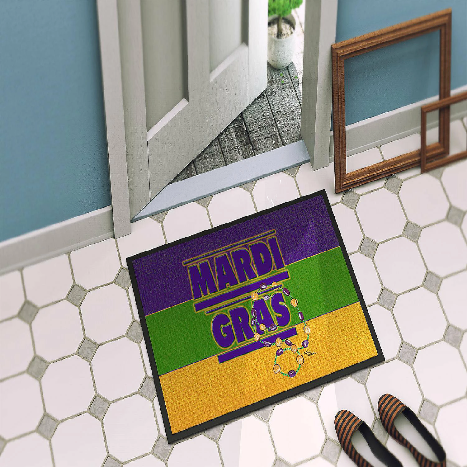 Mardi Gras with Beads Indoor or Outdoor Mat 24×36. Celebrate Mardi Gras with this Mardi Gras Doormat. Welcome your family and friends with this Artwork mat in full color. This action backed mat with hold up in almost any weather condition. This door mat measures about 24 inches by 36 inches and has a black binding tape to hold it’s many layers together. The top layer is a polyester felt that is dyed with the image that you see on the mat. The next couple of layers give the mat stability and the bottom of the mat is rubber that has been stamped to help prevent slipping. To clean this mat, hose it off with a water hose or use a powerwasher. Do not use any cleaner that produces suds. This Doormat is from Caroline’s Treasures New Orleans category of products.