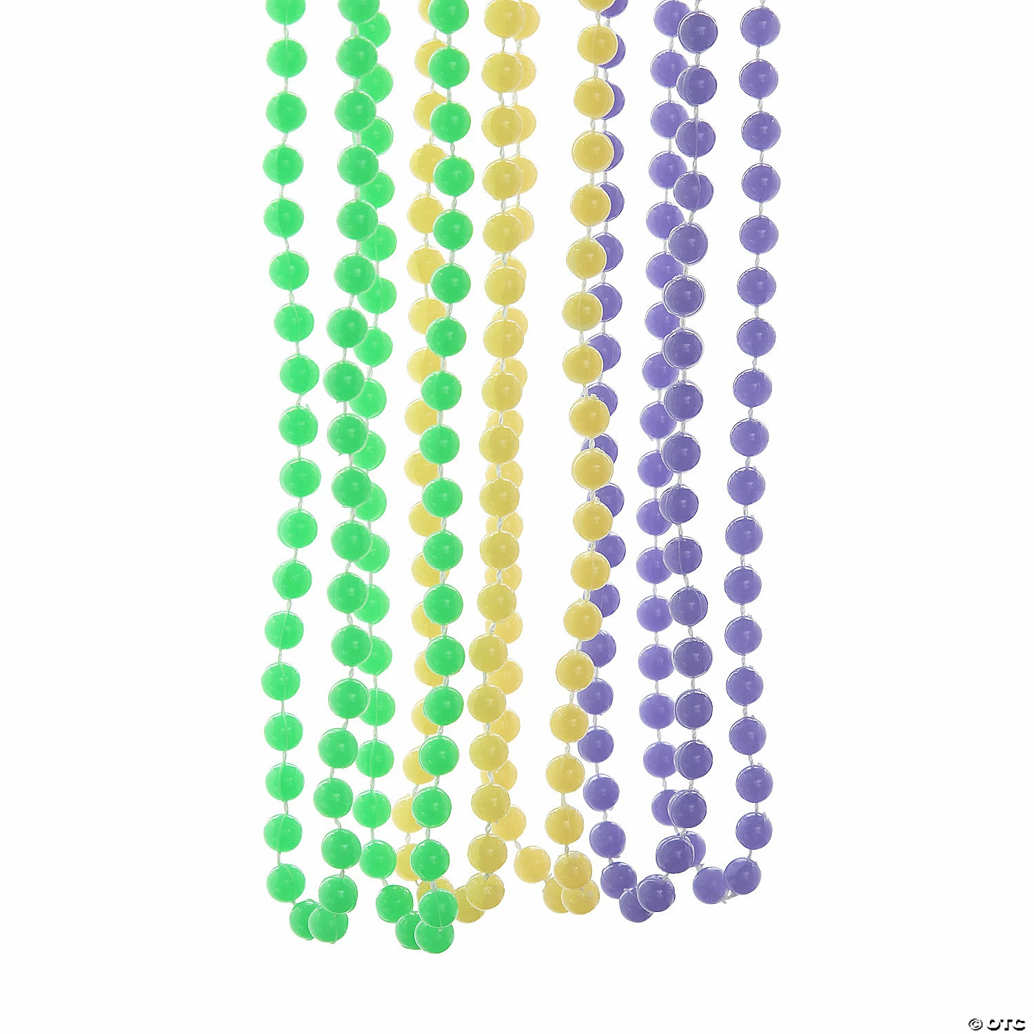 Not all Mardi Gras celebrations take place under the sun on Bourbon Street. Add these fun glow-in-the-dark beads to your Mardi Gras celebration to light things up! Featuring the classic Mardi Gras colors of green, yellow and purple, these icon beads are perfect for wearing, throwing or handing out as party favors. Plastic. (4 dozen per unit) 30″ with 5mm beads with breakway clasp. Expose to direct sunlight to activate glow.