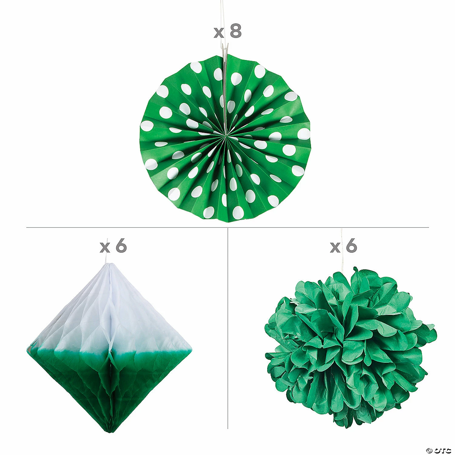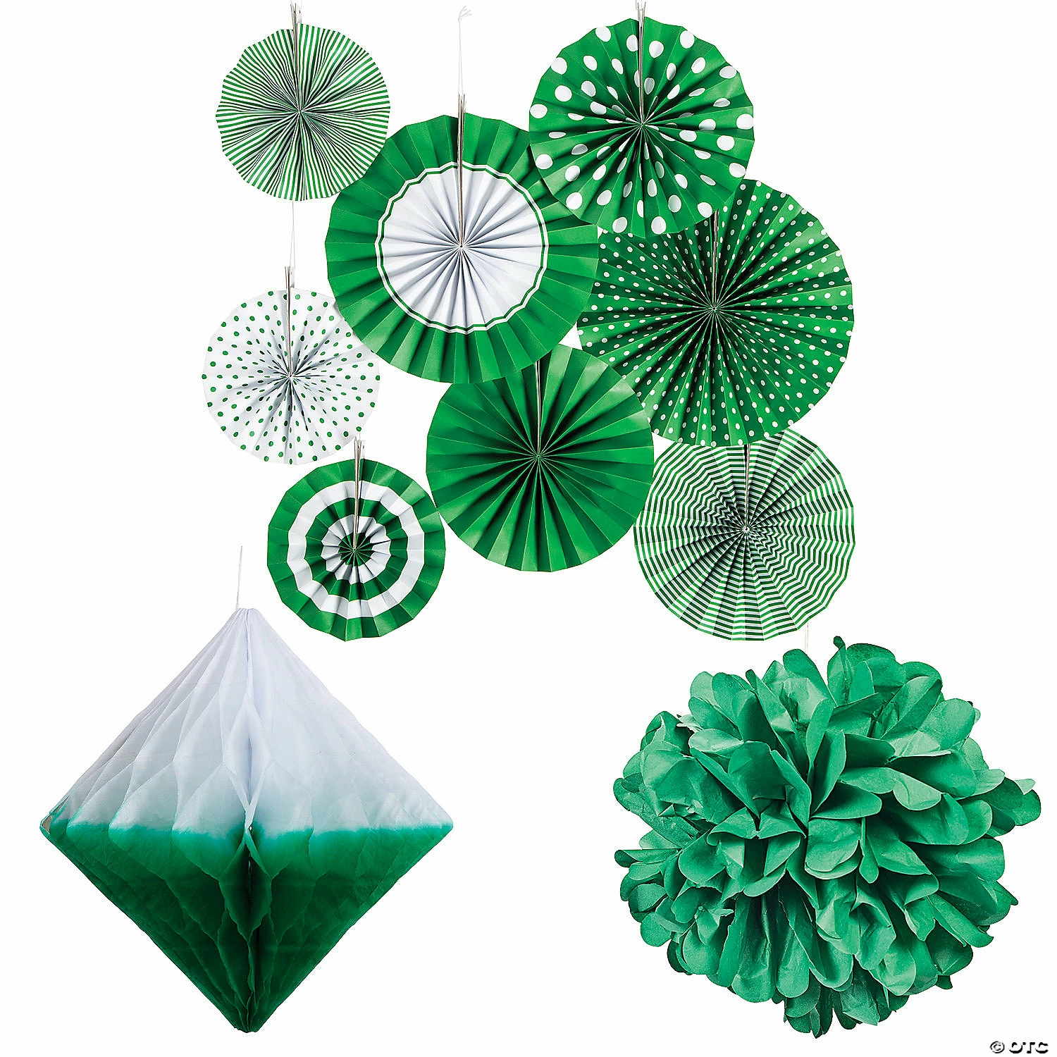 The color green can symbolize many different things: nature, money and go! Use these green hanging decorations to decorate for a graduation party when the school colors include green or as birthday party decorations for someone who loves the color. Take advantage of unused ceiling space to add some variety to your party decorations with these hanging decorations. (20 pcs. per unit) Simple assembly required. Assortment may vary. Includes:• 6 Tissue paper Green Hanging Diamond Honeycomb Decorations (9 1/2″ x 10″ diam. Simple assembly required.)• 8 Green Hanging Paper Fans (8″ diam. – 10″ diam.)• 6 Green Tissue Pom-Pom Decorations (15″ with satin cord hanger.)