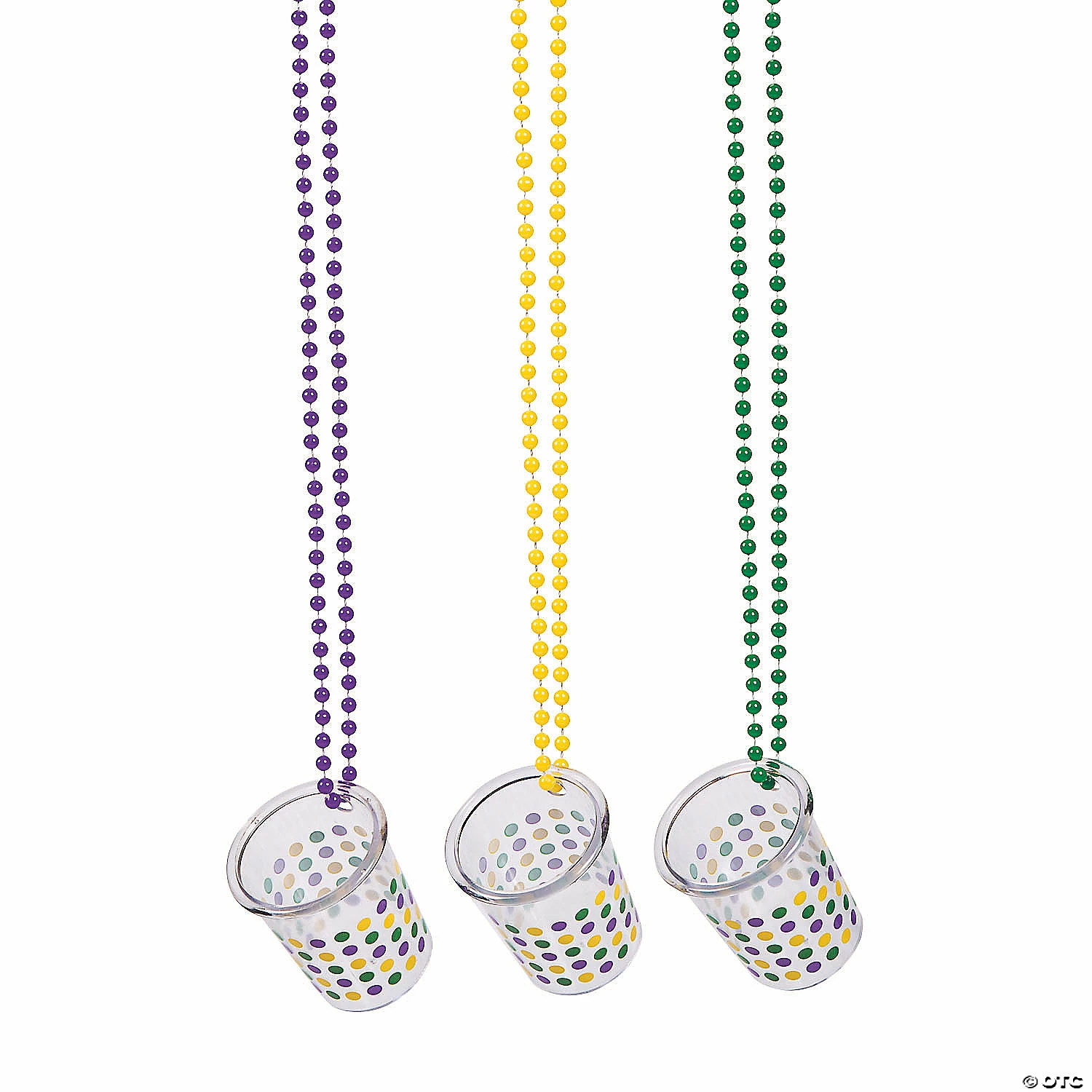 Cheers to making Mardi Gras marvelous! A must-have for Mardi Gras party supply beads or accessories, these festive shot glasses come attached on colorful strands of beads. Pass one out to each guest as they arrive, and they’ll have a blast sporting ’em all party long. There’s plenty of purple, green and gold here to put everyone in the mood to celebrate! Plastic. Each 1-oz. 2″ shot glass is attached to a 30″ strand of beads. © OTC