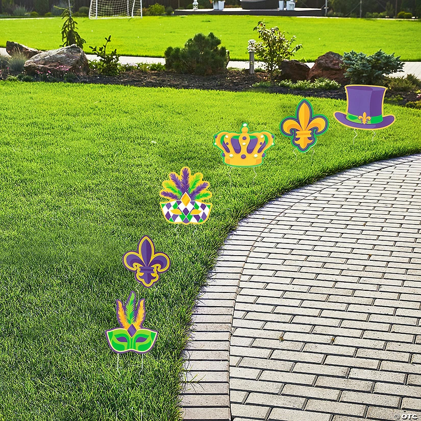 You’ll have the best yard-i for Mardi Gras with the help of these colorful sidewalk signs! Each sign features a classic Mardi Gras image like masks, crowns and the Fleur de Lis. Display these outdoor Mardi Gras decorations for this annual celebration to make your street feel a little more like Bourbon Street! Plastic. (6 pcs. per unit) 8″ – 10″ x 8″ – 9 3/4″ Includes metal stakes. Single-sided. Simple assembly required. © OTC Mardi Gras Fleur de Lis Sidewalk Sign Instructions