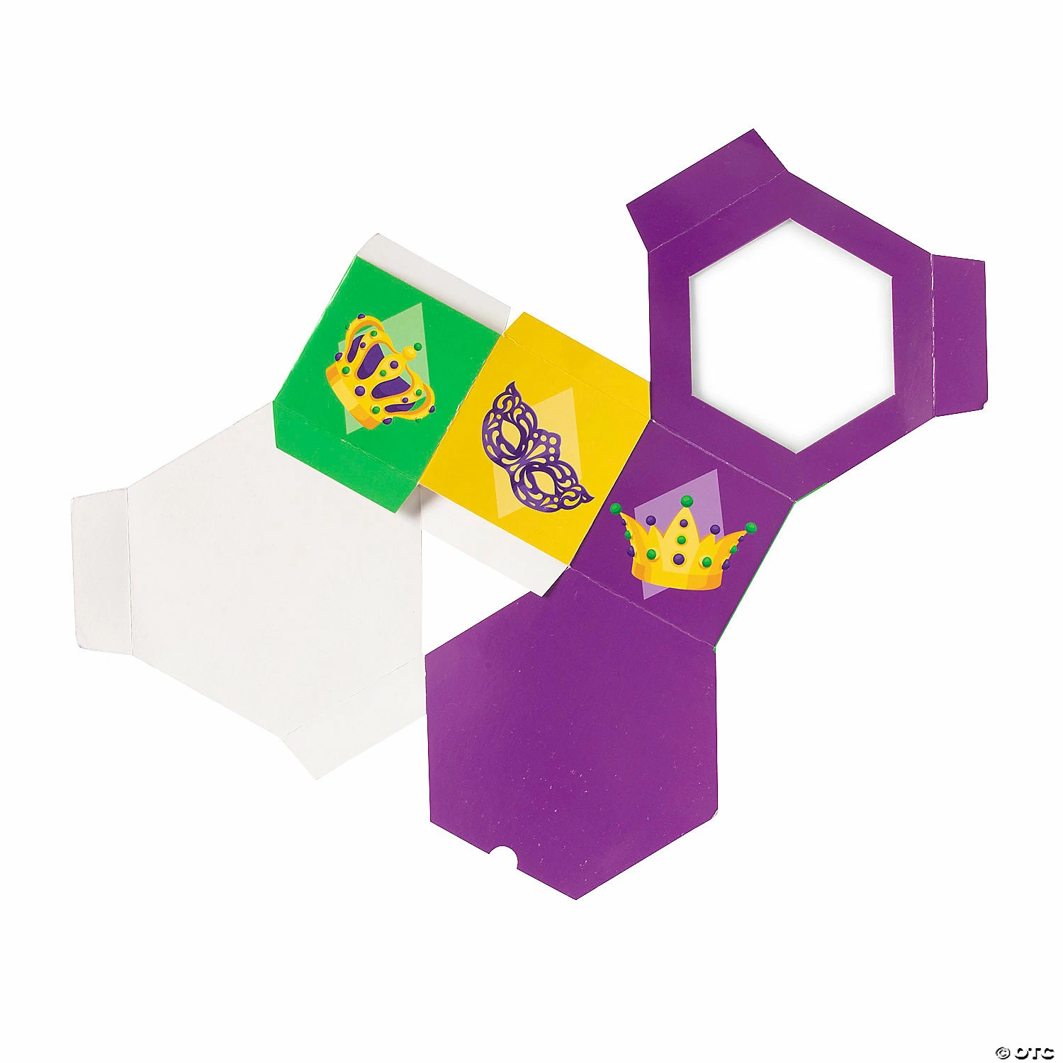 These vibrantly colored treat boxes are just begging to be filled with crab cakes, beignets, muffins and other Mardi Gras musts! Whether you’re hosting a Mardi Gras party, participating in a Mardi Gras parade or heading to a Fat Tuesday celebration, these favor boxes help you let the good times roll! Cardstock. 5″ x 5″ x 2 1/2″ Simple assembly required. © OTC