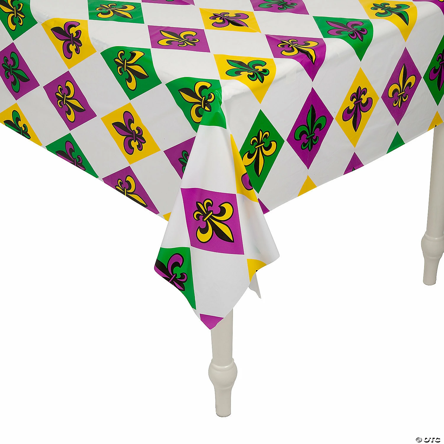 Protect tables and make cleaning up after your Mardi Gras party a cinch with this disposable table roll. Featuring an eye-catching repeating Fleur de Lis pattern with the traditional Mardi Gras colors of green, yellow and purple, this table roll is an excellent addition to Mardi Gras decorations and party supplies. © OTC• Plastic.• Disposable.• Arrives folded in half on a 20” roll.• 40″ x 100 ft.
