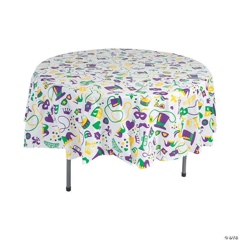 Let the good times roll! Make sure your Mardi Gras party tables are mess-free with the help of this Mardi Gras Tablecloth! Make sure you get multiple so all of your tables can get in on the festivities. Features assorted Mardi Gras icons like the fleur de lis and crowns. Find more Mardi Gras party supplies and decorations to make your shindig pop throughout this site. © OTC• Plastic. • 84″ diam.• Disposable.
