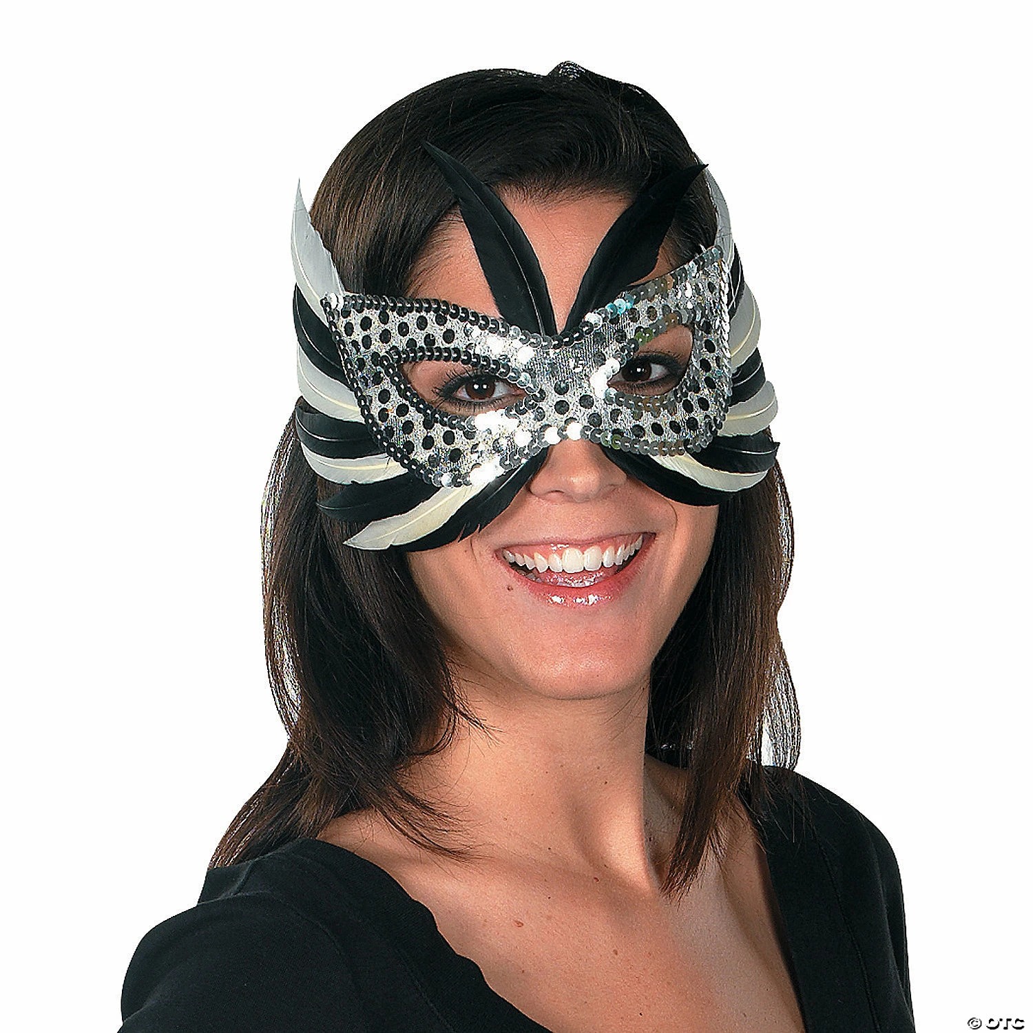Silver spangled masks with black and white feathers would be simply fabulous at the Black and White Ball — or your next Mardi Gras party. These dramatic masks add an air of mystery to any Halloween costume or masquerade, and make the most fashionable fancy dress party favors. Plastic with an elastic band. 14″ x 8″ © OTC