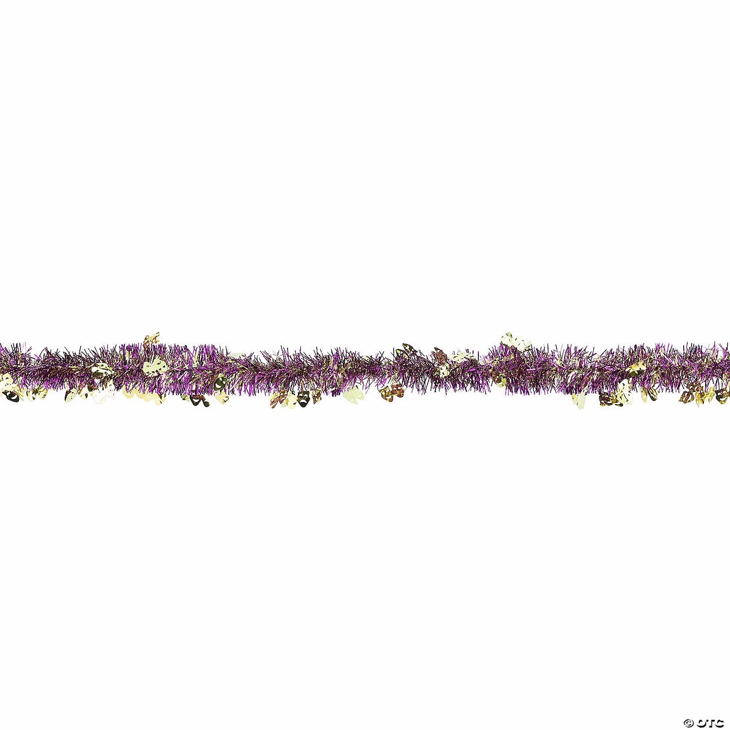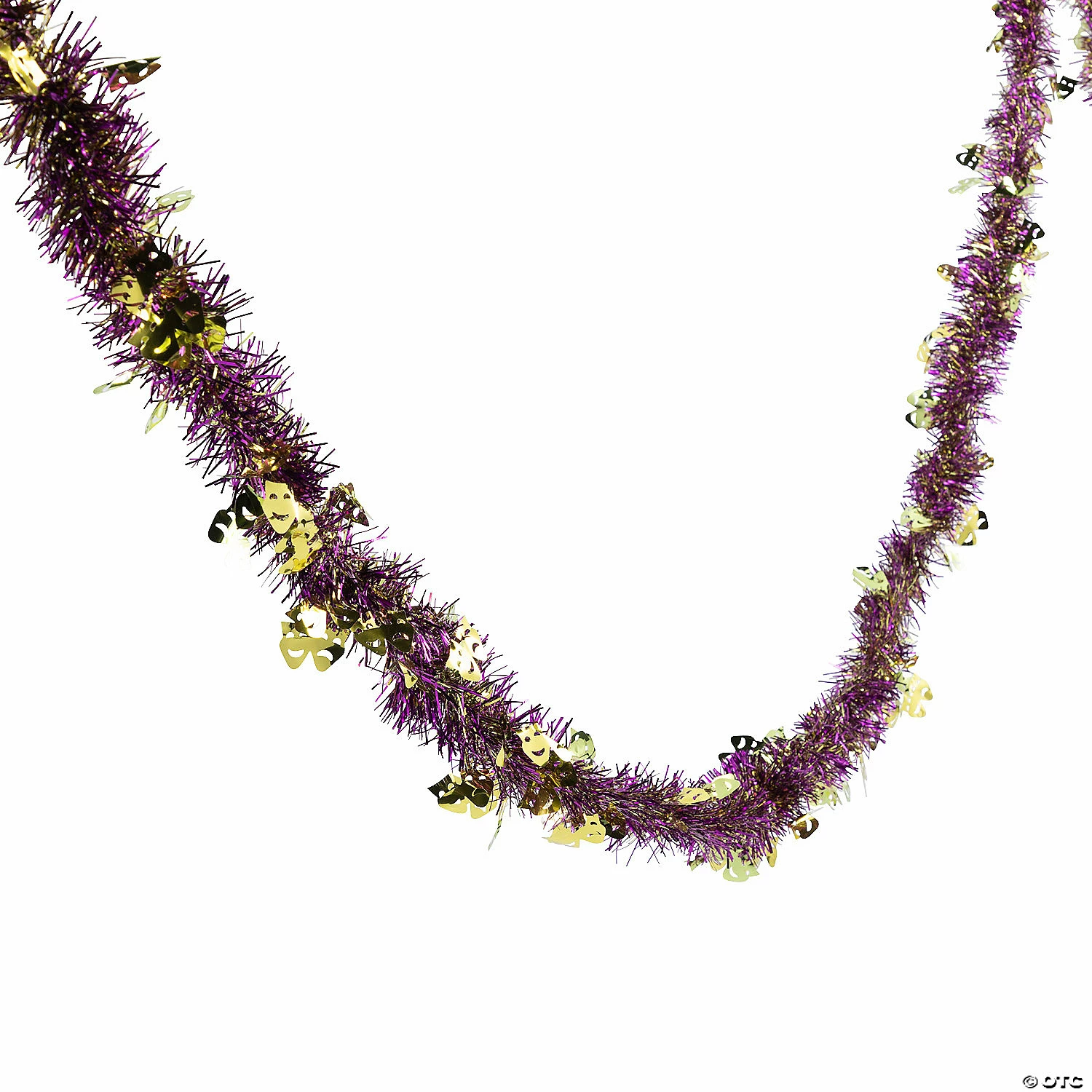 Mardi Gras Tinsel Garland. Use this Mardi Gras decoration for a party, carnival or dance by hanging it windows, mantels, doorways and more! It combines the traditional Mardi Gras colors of green, purple and gold and will make your Mardi Gras party room shimmer and shine! Plastic and foil. 24 ft.