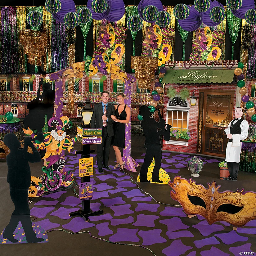 You won’t know what it means to miss New Orleans when you decorate with this festive Mardi Gras parade decorating kit. With a Bourbon Street backdrop and photo props, these party décor supplies will jazz up your masquerade prom, Fat Tuesday corporate event, or milestone birthday party with a little French Quarter flair.Includes:• 1 Cardboard Bourbon Street Mardi Gras Archway (74″ x 103″)• 1 Cardboard Mardi Gras Jester Stand-Up (45 1/2″ x 56″)• 1 Cardboard Mardi Gras Mask Stand-Up (45″ x 5 ft.)• 12 Mardi Gras Tissue Balls (11″ diam.)• 1 Cardboard Masquerade Mask Stand-Up (5 ft. x 27″)• 1 Cardboard Preservation Hall Saxophone Player Stand-Up (29″ x 64″)• 1 Cardboard Preservation Hall Trumpet Player Stand-Up (29″ x 64″)(18 pcs. per unit) Stand-ups are one-sided with a brown cardboard back. Assembly required. © OTC