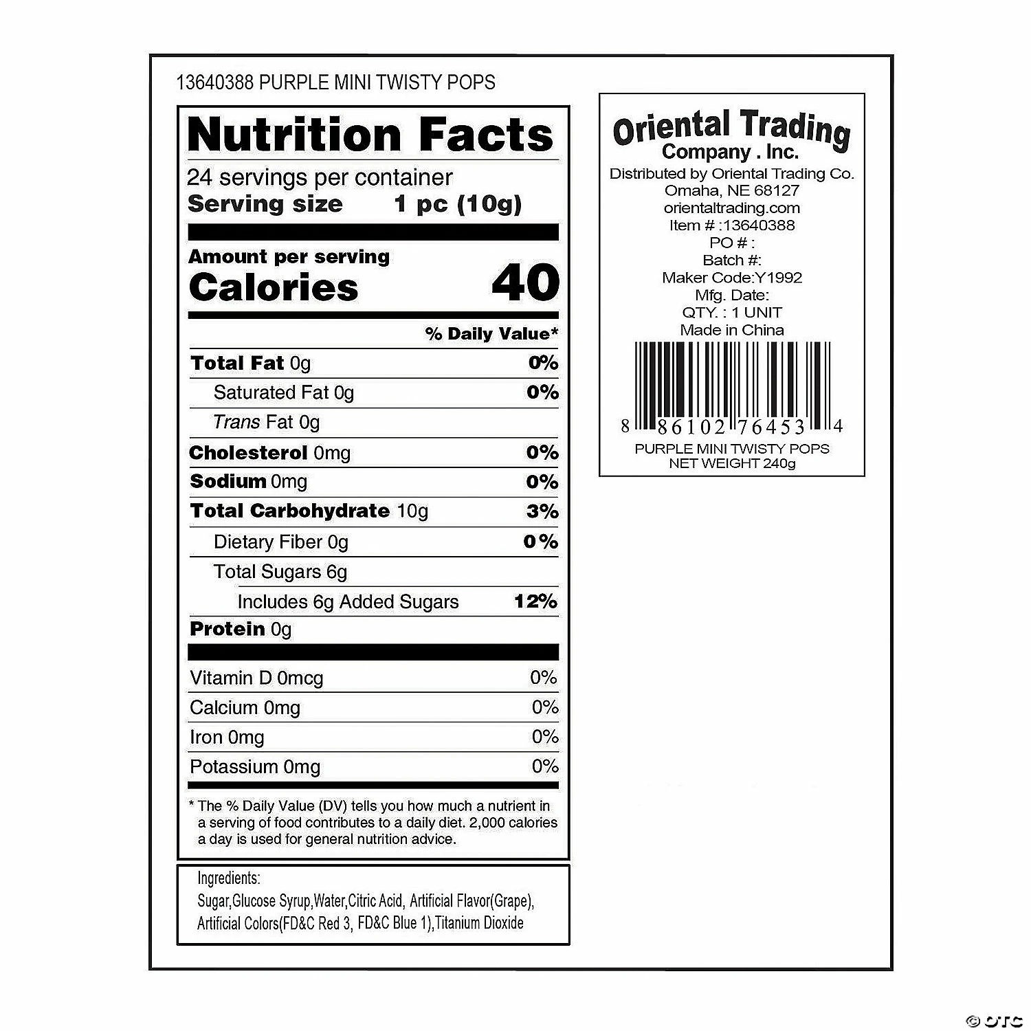 These Mini Twisty Pops make a fun and fashionable addition to your candy buffet! This popular candy can also be used to make wedding reception centerpieces and makes a great addition to party favor bags. Comes in a variety of colors and flavors to sweeten up any soirée! Each 2″ grape-flavored sucker is on a 4″ plastic stick. Individually wrapped. (24 pcs. per unit) Fat-free. Total wt., 9 oz. Candy is non-returnable. For more information, visit our “Return Policy” page located on our website.
