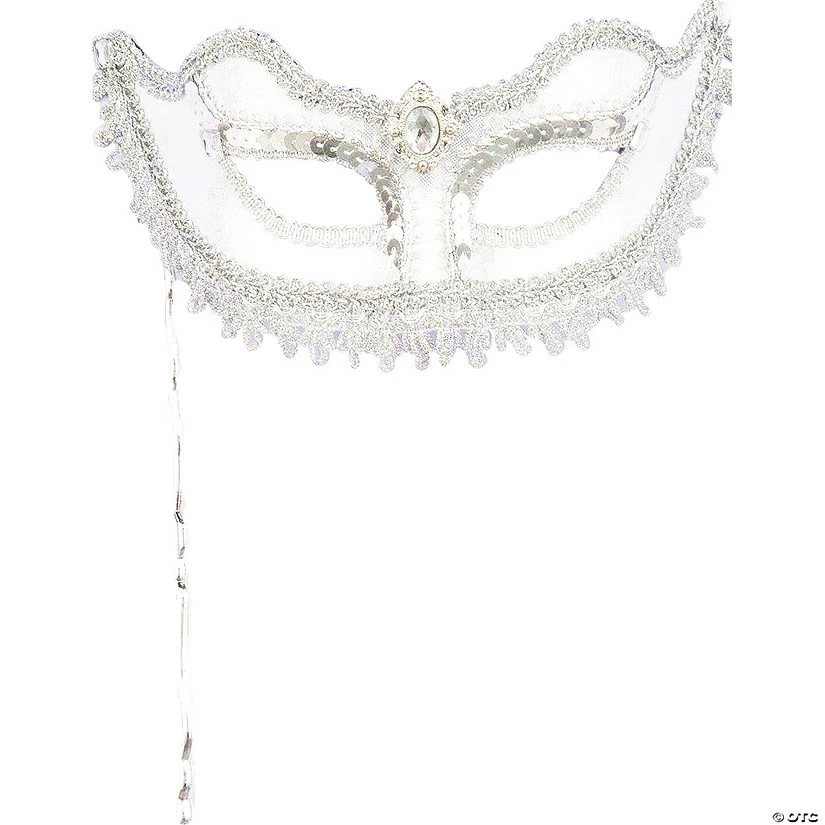 Masquerade Mask. A beautiful mask perfect for masquerade parties of all sorts, including Mardi Gras events! Includes: White mask Lace and sequin detail and bindi like jewel in the middle of the mask. Available size: One size fits most adults.Special Shipping Information: This item ships separately from other items in your order. This item cannot ship to a P.O. Box. This item may be subject to additional processing days.ITEM IS NOT ELIGIBLE FOR EXPEDITED SHIPPING