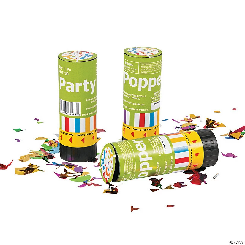 Rotate these plastic Party Poppers and metallic foil confetti pops out! These party favors make a fun-filled way to bring the party indoors during the 4th of July. These favors are also tons of fun during birthday parties, Mardi Gras parties, bachelorette parties, New Year’s Eve parties – basically any party you have! 4 1/4″ Popper is spring activated, no gunpowder or firework materials in this product. © OTC