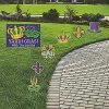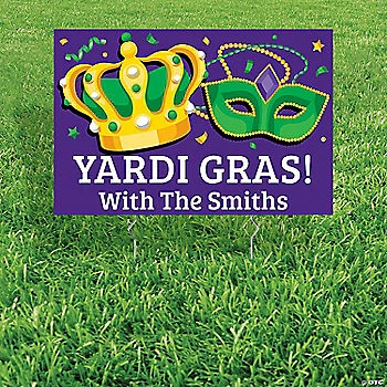 Ready for a fun Mardi Gras in your own yard? Display this personalized yard sign featuring a “Yardi Gras!” message along with Mardi Gras images in the traditional colors of green, purple and yellow to wish everyone in the community a happy “Yardi Gras”. Be sure to check out all our Mardi Gras supplies to add to your Yardi Gras celebration. Single-sided. Includes metal stakes. Corrugated plastic. 24″ x 16″ Personalize with 1 line of text. Simple assembly required. © OTC