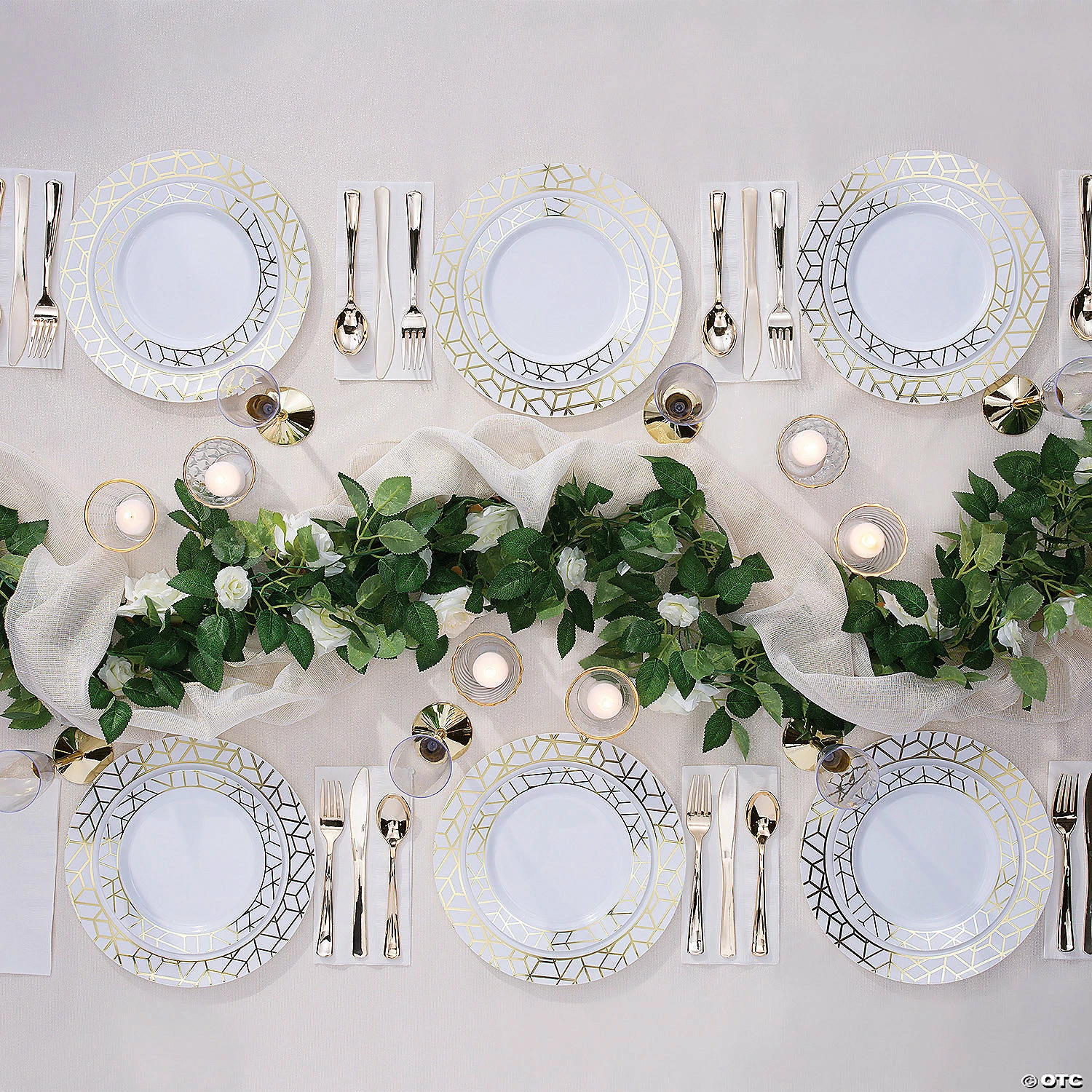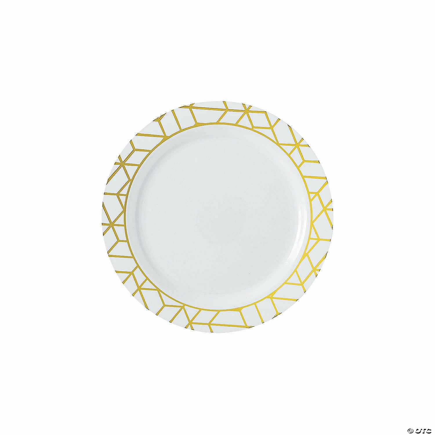 Get funky with your desserts when you serve them on these dessert plates! Boasting fashionable gold designs, this premium tableware is great for serving cake, pie and other tasty desserts at wedding receptions, anniversary parties and many other celebrations that call for an elegant touch. Plastic. (25 pcs. per unit) 7 1/4″ Not microwave safe.Hand wash only. © OTC