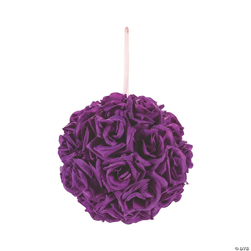 Add these deep purple wedding flowers to your décor for a truly regal aesthetic. The lush flower ball looks beautiful used as a flower girl bouquet or ceremony chair decoration. To fill your entire reception space with rich florals, purchase several of the rose kissing balls, and hang them from them the ceiling or in entryways. Polyester. 7 3/4″ diam. with 6″ satin loop.