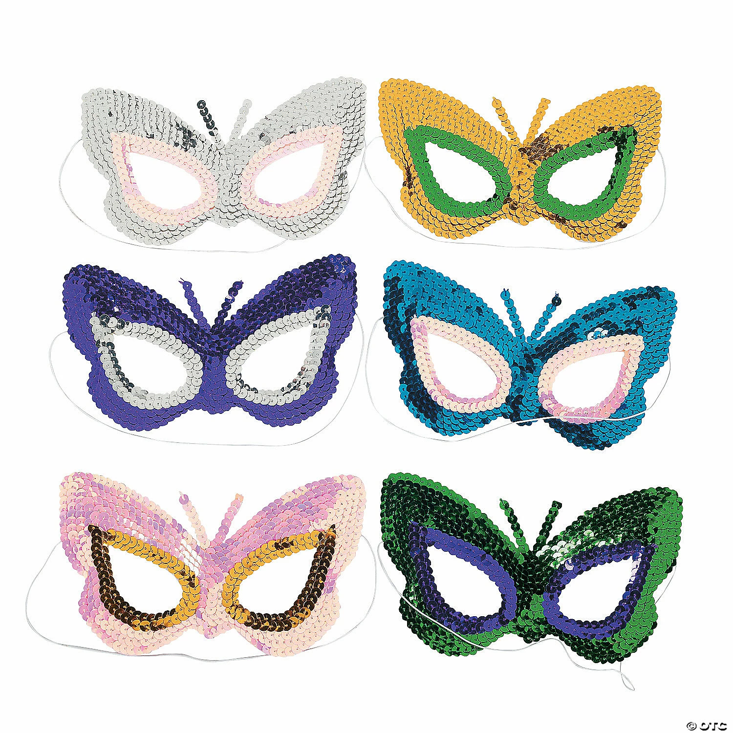 Sequined butterfly masks add a flight of fancy to any celebration. Don one of these fancy masks to attend the Mardi Gras masquerade ball, or adorn your eyes with the sparkly wings as part of an overall butterfly Halloween costume. Plastic sequins on a felt mask with elastic band. 6 1/2″