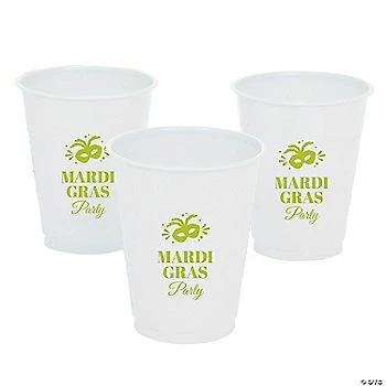 Let the good times roll with these personalized plastic cups! These disposable party cups feature a Mardi Gras mask image along with personalized text. Add these fun cups to your Mardi Gras party supplies to stock up your beverage station or bar. Cleaning up after the Mardi Gras bash will be easier than ever with these disposable cups. Plastic. (40 pcs. per unit) 5 1/2″ 16 oz. Personalize with 3 lines of text. © OTC